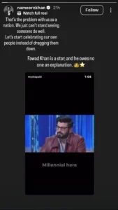 اسی طرح اداکار نمیر خان نے انسٹاگرام پر فواد خان کے کیریئر پر مبنی ویڈیو شیئر کرتے ہوئے لکھا کہ “یہی ہمارا قومی المیہ ہے، ہم کسی کو کامیاب دیکھ نہیں سکتے۔ ہمیں اپنے لوگوں کی کامیابی پر فخر کرنا چاہیے، نہ کہ انہیں نیچا دکھانا۔ فواد خان ایک اسٹار ہیں، انہیں کسی وضاحت کی ضرورت نہیں۔”