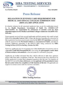 کئی امیدواروں اور ان کے والدین کی درخواستوں پر، جو بروقت جیووینائل کارڈ یا CNIC حاصل نہ کر سکے، MDCAT کمیٹی نے متفقہ طور پر یہ فیصلہ کیا ہے۔ یہ فیصلہ صوبائی کابینہ (حکومت سندھ) کی منظوری سے کیا گیا ہے تاکہ امیدواروں کو MDCAT 2025 میں شرکت میں سہولت فراہم کی جا سکے، جو SIBA Testing Services (STS) کے ذریعے اتوار، 26 اکتوبر 2025 کو منعقد ہو رہا ہے۔