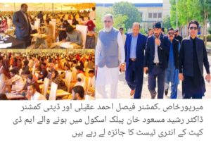 ڈویژنل کمشنر فیصل احمد عقیلی نے ڈپٹی کمشنر ڈاکٹر رشید مسعود خان اور ایس ایس پی ڈاکٹر سمیر نور چنہ کے ہمراہ میر شیر محمد خان تالپور پبلک اسکول میرپور خاص میں آئی بی اے سکھر کے زیر اہتمام ایم ڈی کیٹ انٹری ٹیسٹ سینٹر کا دورہ کیا اور تمام سہولیات کا جائزہ لیا. اس موقع پر ایم ڈی ٹیسٹ کے فوکل پرسن و پبلک اسکول کے پرنسپل پروفیسر عمران لاڑک نے بتایا کہ ایم ڈی کیٹ انٹری ٹیسٹ میں تین اضلاع میرپورخاص ، عمرکوٹ اور تھرپارکر کے 1560 طلبہ و طالبات ٹیسٹ میں حصہ لے رہے ہیں اور 26 بلاکس بنائے گئے ہیں جبکہ 200 انویجیلیٹرز اور عملہ مقرر کیا گیا ہے اور انٹری ٹیسٹ کے قبل تمام انتظامات مکمل کر لیے گیے تھے اور سیکیورٹی کے بھی انتظامات کو بھی یقینی بنایا گیا ہے اس موقع پر آئی بی اے سکھر انٹری ٹیسٹ کے انچارج واحد بخش قاضی، ایڈیشنل ڈپٹی کمشنر ٹو فیصل علی سومرو اور دیگر متعلقہ افسران موجود تھے.