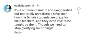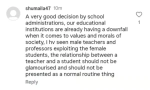 سوشل میڈیا پر ردِعمل ملا جلا ہے۔ کچھ صارفین کا کہنا ہے کہ استاد اور طالبہ کے تعلق کو سماجی حقیقت کی عکاسی سمجھا جانا چاہیے نہ کہ تنقید کا نشانہ بنایا جائے۔ اکثر صارفین نے تعلیمی اداروں کے اقدامات کو سراہتے ہوئے کہا کہ اس سے تعلیمی ماحول کا تقدس برقرار رہے گا اور غیر ضروری تنازعات سے بچا جا سکے گا۔