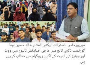 خواتین کو چاہیے کو وہ اپنے ووٹ کے اندراج کو یقینی بنائیں . یہ بات انہوں نے ڈسٹرکٹ الیکشن کمیشن آف پاکستان میرپورخاص کے زیرِ اہتمام گورنمنٹ ڈگری کالج میر حاجی خدا بخش ٹالپر ٹنڈو جان محمد میں منعقدہ ووٹر آگاہی پروگرام سے خطاب کرتے ہوئے کہی. اس پروگرام میں طالبات، اساتذہ اور سول سوسائٹی کے نمائندوں نے بڑی تعداد میں شرکت کی۔ پروگرام کا مقصد نوجوان نسل، خصوصاً طالبات میں ووٹ کی اہمیت، جمہوریت کے استحکام اور قومی ذمہ داریوں کے بارے میں شعور پیدا کرنا ہے تقریب کے دوران طالبات کی جانب سے علامتی پولنگ اسٹیشن کا قیام، کوئز مقابلہ، تقاریر اور معلوماتی پرفارمنسز پیش کی گئیں، جن میں جمہوریت اور ووٹر کے اہم کردار کو خوبصورت انداز میں اجاگر کیا گیا ۔ڈسٹرکٹ الیکشن کمشنر خالد حسین نے اپنے خطاب میں کہا کہ ووٹر کی تعلیم اور آگاہی جمہوریت کا بنیادی جز ہے، کیونکہ باشعور ووٹر ہی شفاف انتخابی عمل اور مضبوط جمہوریت کی ضمانت ہیں۔ انہوں نے نوجوانوں پر زور دیا کہ وہ نہ صرف خود ووٹ کا حق استعمال کریں بلکہ دوسروں کو بھی ووٹ دینے کی ترغیب دیں اس موقع پر پرنسپل گورنمنٹ ڈگری کالج میر حاجی خدا بخش ٹالپر اور دیگر اساتذہ نے بھی اپنے خیالات کا اظہار کرتے ہوئے کہا کہ ایسی سرگرمیاں طالبات میں قومی شعور کو بیدار کرتی ہیں اور انہیں ایک ذمہ دار شہری کے طور پر اپنے کردار کی پہچان دلاتی ہیں پروگرام کے اختتام پر شریک طالبات میں انعامات تقسیم کیے گئے۔