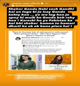 جویریہ سعود نے صبا قمر کے بیان پر ردعمل دیتے ہوئے اداکارہ عفت عمر کو جواب میں کہا کہ کراچی گندا نہیں، لوگوں کی سوچ گندی ہے، جو اس کو گندا کہتے ہیں، یہ وہی لوگ ہیں جو اپنے ہی ملک کو گندا کہہ رہے ہیں، کراچی ہو یا پاکستان کا کوئی بھی شہر ہمیں تو ہماری دھرتی کا ایک ایک کونہ پیارا ہے۔