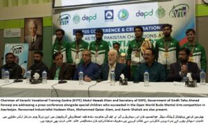 چیئرمین کراچی ووکیشنل ٹریننگ سینٹر عبدالحسیب خان اور،سیکریٹری ڈی ای ایف ڈی،حکومت سندھ طحہٰ احمدفاروقی آذربائیجان میں اوپن ورلڈ بودو مارشل آرٹس مقابلے میں کامیاب اسپیشل بچوں کے ہمراہ پریس کانفرنس سے خطاب کررہے ہیں،معروف صنعتکارندیم خان،محمدقیصر عالم، عامر شہاب بھی موجود ہیں۔