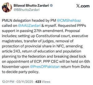 مسلم لیگ ن کے وفد نے 27ویں آئینی ترمیم کی منظوری میں پاکستان پیپلزپارٹی کی حمایت مانگی، چیئرمین بلاول بھٹو زرداری