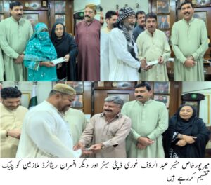 میونسپل کارپوریشن میرپورخاص کی جانب سے 20 سے زائد ملازمین کو گریجویٹی چیک اور دو انکیشمنٹ چیک تقسیم کرنے کی تقریب منعقد کی گئی تفصیلات کے مطابق میونسپل کارپوریشن میئر عبدالروف غوری کے آفس میں 20 سے زائد ملازمین کو گریجویٹی اور دو انکیشمنٹ چیک تقسیم کرتے ہوئے مئیر عبدالروف غوری کا کہنا تھا کہ کارپوریشن کے ریٹائرڈ ملازمین کی پریشانی کو مدنظر رکھتے ہوئے انکے بقایا جات گریجویٹی چیک آج انکو تقسیم کیے جارہے ہیں اور ہماری کوشش ہے کہ محمود وسائل میں تمام ریٹائرڈ ملازمین کو گریجویٹی کی رقم جلد سے جلد انکو دی جائے مئیر عبدالروف غوری نے کہا کہ ملازمین ہمارا اثاثہ تھے جنھوں نے اس ادارے کو اپنی زندگی دی ہے ہماری کوشش بھی ہے کہ انکو انکے بقایاجات جلد سے جلد دیئے جائیں اس موقع پر ڈپٹی مئیر سمیرا بلوچ یونین عہدیداران مظہر عباسی عابد علی اور دیگر کا کہنا تھا کہ مئیر عبدالروف غوری کی جانب سے اچھی روایت قائم کی گئی ہے اور تمام ریٹائرڈ ملازمین کو انکے گریجویٹی چیک قتقسیم کی تقریب کا انعقاد کیا گیا اس موقع پر تقریب میں موجود ریٹائرڈ ملازمین نے مئیر عبدالروف غوری اور کارپوریشن کے افسران کا شکریہ ادا کیا اس موقع پر کارپوریشن کے ممبران اور افسران کی ایک بڑی تعداد شریک تھی