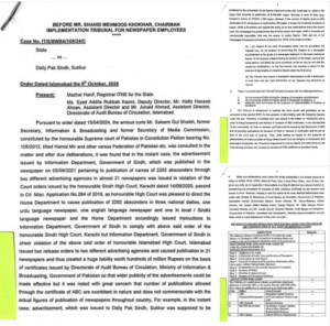 اخباری ملازمین کے نفاذی ٹریبونل (IMPLEMENTATION TRIBUNAL FOR NEWSPAPER EMPLOYEES) نے اپنے 18 صفحات پر مشتمل فیصلے میں محکمہ اطلاعات سندھ کے ستمبر2021 میں کئے جانے والے کرپشن کارنامے کی کہانی بیان کردی جس میں افسران نے کروڑوں روپے کا چھکا لگا کر اپنی جیبیں بھریں تھیں