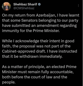 سوشل میڈیا پر جاری کیے گئے پیغام میں وزیراعظم شہباز شریف نے کہا کہ مجھے بتایا گیا کہ ان کی پارٹی کے چند سینیٹرز نے وزیراعظم کے استثنیٰ کے حوالے سے ترمیمی شق سینیٹ میں پیش کی، جو کابینہ سے منظور شدہ مسودے میں شامل نہیں تھی۔