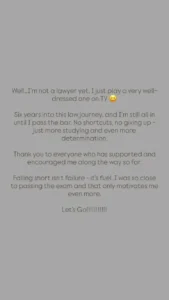 انہوں نے مزید لکھا، ’6 سال اس قانونی سفر میں گزر چکے ہیں اور جب تک وکالت کا امتحان پاس نہیں کر لیتی میں پیچھے نہیں ہٹوں گی۔ کوئی شارٹ کٹ نہیں، کوئی ہار نہیں، بس مزید عزم کے ساتھ اور زیادہ پڑھائی‘۔