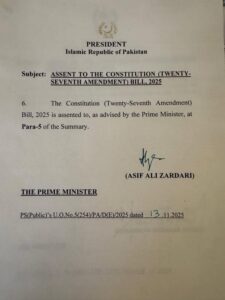 صدر مملکت آصف علی زرداری نے 27ویں آئینی ترمیم بل پر دستخط کر دیے۔