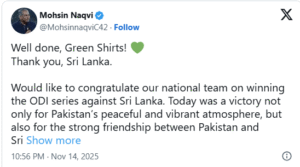 محسن نقوی نے سری لنکا کےخلاف ون ڈے سیریز جیتنے پر قومی ٹیم کو مبارکباد دی دینے کے ساتھ پاکستانی ٹیم کی تعریف کرتے ہوئے کہا کہ ویلڈن گرین شرٹس، اس کے ساتھ ہی چیئرمین پی سی بی نے تھینک یو سری لنکا بھی کہا۔