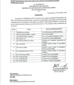 وفاقی حکومت نے صحافیوں اور میڈیا پروفیشنلز کے تحفظ کے ایکٹ 2021 کی شق 11 کے تحت صحافیوں اور میڈیا ورکرز کے تحفظ کیلیے ایک خود مختار کمیشن قائم کردیا ہے۔ اس حوالے سے وزارت اطلاعات و نشریات نے باقاعدہ نوٹیفکیشن بھی جاری کردیا۔
