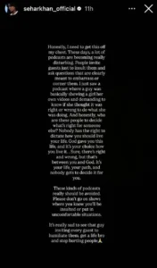 سحر خان نے لکھا کہ ایمانداری کی بات یہ ہے کہ انہیں یہ بات دل سے نکالنی تھی، آج کل بہت سے پوڈکاسٹ واقعی پریشان کن ہو گئے ہیں، لوگ مہمانوں کو صرف اس لیے بلاتے ہیں کہ ان کی توہین کریں، ان سے شرمندہ کرنے والے سوالات پوچھیں اور ان کی تذلیل کریں۔