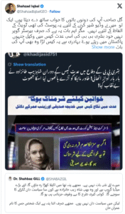 سماجی رابطے کی سائٹ ایکس پر سینئر اینکر پرسن اور صحافی شہزاد اقبال نے لکھا کہ ’گل صاحب آپ کی دونوں باتوں کا جواب ساتھ دے دیتا ہوں، ایک تو میں نے ویڈیو شیئر کرنے کیلئے یہ پوسٹ کی تھی، ٹوئٹ کے الفاظ کیلئے نہیں ‘۔