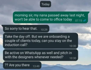 سوشل میڈیا پر وائرل اسکرین شاٹ میں دیکھا جاسکتا ہے کہ ایک ملازم نے اپنے مینیجر سے نانا کی موت کے بعد چھٹی کی درخواست کی ہے، جس پر مینیجر نے بےحسی کا مظاہرہ پیش کرتے ہوئے چھٹی تو دی مگر واٹس ایپ پر ایکٹو رہنے اور کام میں مدد کرنے کا بھی کہہ دیا۔