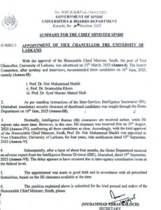 لاڑکانہ میں نئی اپگریڈ کی گئی یونیورسٹی آف لاڑکانہ میں مبینہ طور پر بغیر سیکیورٹی کلئیرنس کے وائس چانسلر تعینات ہونے کا انکشاف تفصیلات کے مطابق قانون نافظ کرنے والے ادارے کے سامنے آنے والے لیٹر کے مطابق سندھ حکومت کی جانب سے یونیورسٹی آف لاڑکانہ میں وائس چانسلر کے عہدے پر تعیناتی کی سیکیورٹی کلئیرنس کے لیے تین نام قانون نافذ کرنے والے ادارے کو بھجوائے گئے تھے جن میں سے دو افراد پروفیسر ڈاکٹر امام الدین کھوسو اور پروفیسر ڈاکٹر منیر احمد شاہ کو عہدے کے لیے کلئیر کیا گیا تھا تاہم قانون نافذ کرنے والے ادارے کی جانب سے ڈاکٹر نیک محمد شیخ کی سیکیورٹی کلئیرنس نہیں دی گئی تھی جبکہ سندھ حکومت کی جانب سے سیکیورٹی کلئیرنس نہ ملنے کے باوجود پروفیسر نیک محمد شیخ کو رواں سال ستمبر میں بطور وائس چانسلر یونیورسٹی آف لاڑکانہ تعینات کیا گیا ذرائع کے مطابق پروفیسر نیک محمد شیخ مبینہ طور پر ایک با اثر سیاسی رہنما کے قریبی عزیز ہیں جبکہ تعیناتی مبینہ طور پر اقربا پروری اور سیاسی پشت پناہی کے باعث کی گئی ہے ۔