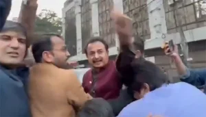 کراچی پریس کلب کے باہر پاکستان تحریک انصاف (پی ٹی آئی) کارکنوں نے احتجاج کیا تھا، حلیم عادل شیخ اپنے رہنماؤں اور کارکنوں کے ساتھ مظاہرے کیلئے پہنچے تھے۔