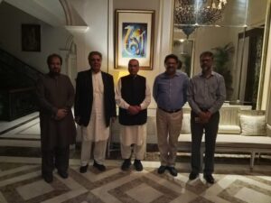 عوام پاکستان پارٹی کے مرکزی سیکریٹری جنرل ڈاکٹر مفتاح اسمٰعیل کی رہائش گاہ پر ملک کے ممتاز دانشور و سینیئر صحافی محترم مجیب الرحمٰن شامی اور محترم حفیظ اللہ خان نیازی کی تشریف آوری کے موقع پر عوام پاکستان پارٹی سندھ کے جنرل سیکریٹری ناصر الدین محمود اور کراچی کے آرگنائزر صلاح الدین شیخ کا گروپ فوٹو