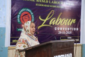 ہوم بیسڈ لیبر یونین کے زیر اہتمام حیدآباد پریس کلب میں پہلا لیبر کنونشن منعقد کیا گیا جس میں بڑی تعداد میں خواتین نے شرکت کی اس موقع پر نظامت کے فرائض ہوم بیسڈ ورکرز یونین (رجسٹرڈ) کی جنرل سیکرٹری محترمہ عرفانہ عبد الجبار نے انجام ادا کئے