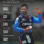 بنگلہ دیشی آل راؤنڈر شکیب الحسن نے ٹی ٹوئنٹی کرکٹ میں ایک نیا تاریخی سنگِ میل عبور کیا ہے۔ تفصیلات کے مطابق شکیب الحسن اب ٹی ٹوئنٹی کرکٹ میں 500 وکٹیں حاصل کرنے والے پانچویں بولر بن گئے ہیں۔ https://x.com/CPL/status/1959668881779507222?ref_src=twsrc%5Etfw%7Ctwcamp%5Etweetembed%7Ctwterm%5E1959668881779507222%7Ctwgr%5E885facbab815e015ff6e50dc0d1e81928f8653fb%7Ctwcon%5Es1_c10&ref_url=https%3A%2F%2Fwww.express.pk%2Fstory%2F2775588%2Fshakib-al-hasan-creates-history-in-t20-cricket-2775588 یہ کارنامہ انہوں نے سی پی ایل میں انٹیگا اینڈ باربوڈا فالکنز کی نمائندگی کرتے مزید پڑھیں